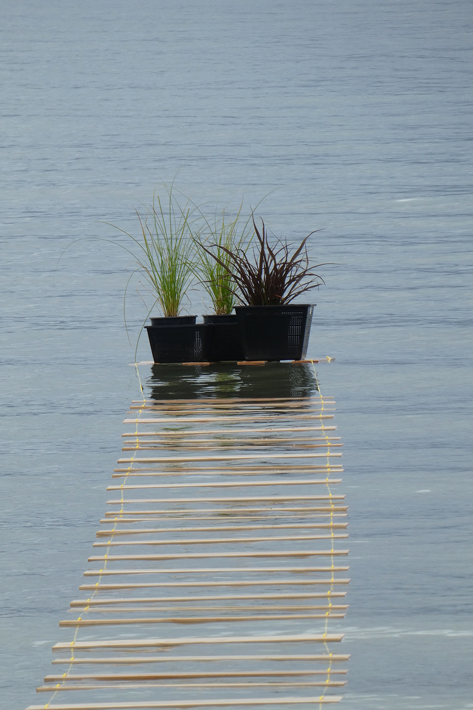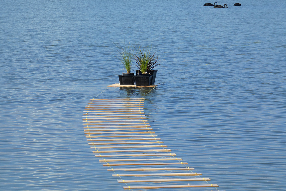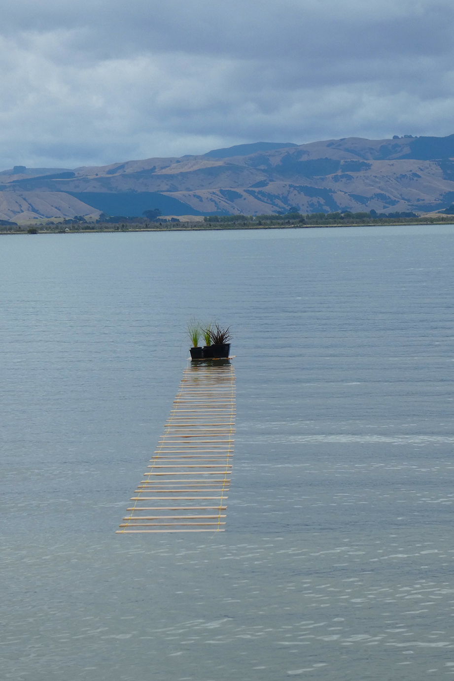 Conversations in Water, presented a temporary floating pathway and miniature wetland set floating on the surface of Wairarapa Moana. While seemingly precariously attached to the lake shore, the work continued to draw the viewer’s eyes and imagination across the water’s surface, each incredulous step presenting a set of new possibilities and choices.